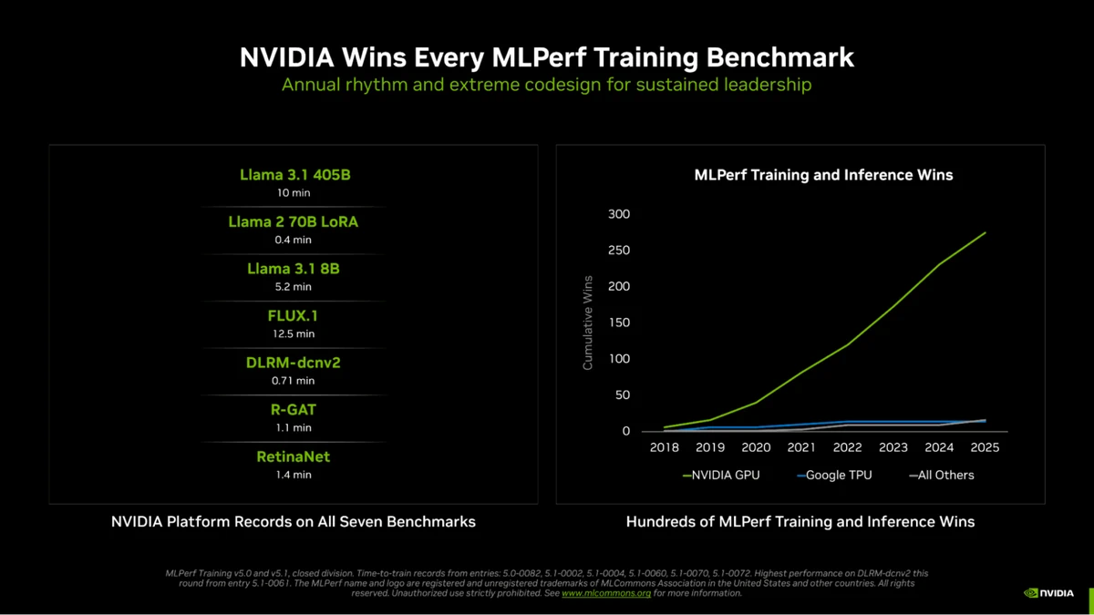 NVIDIA Blackwell Ultra GPU 在 MLPerf Training v5.1 中展現強勢效能,橫掃全部七項測試,於大型語言模型 (LLM)、圖像生成、推薦系統、電腦視覺和圖像神經網路等領域均創下最快的訓練速度。NVIDIA 亦是唯一在所有測試項目中都提交結果的平台,彰顯 NVIDIA GPU 強大的可程式化特性,以及其 CUDA 軟體堆疊的成熟度和通用性。