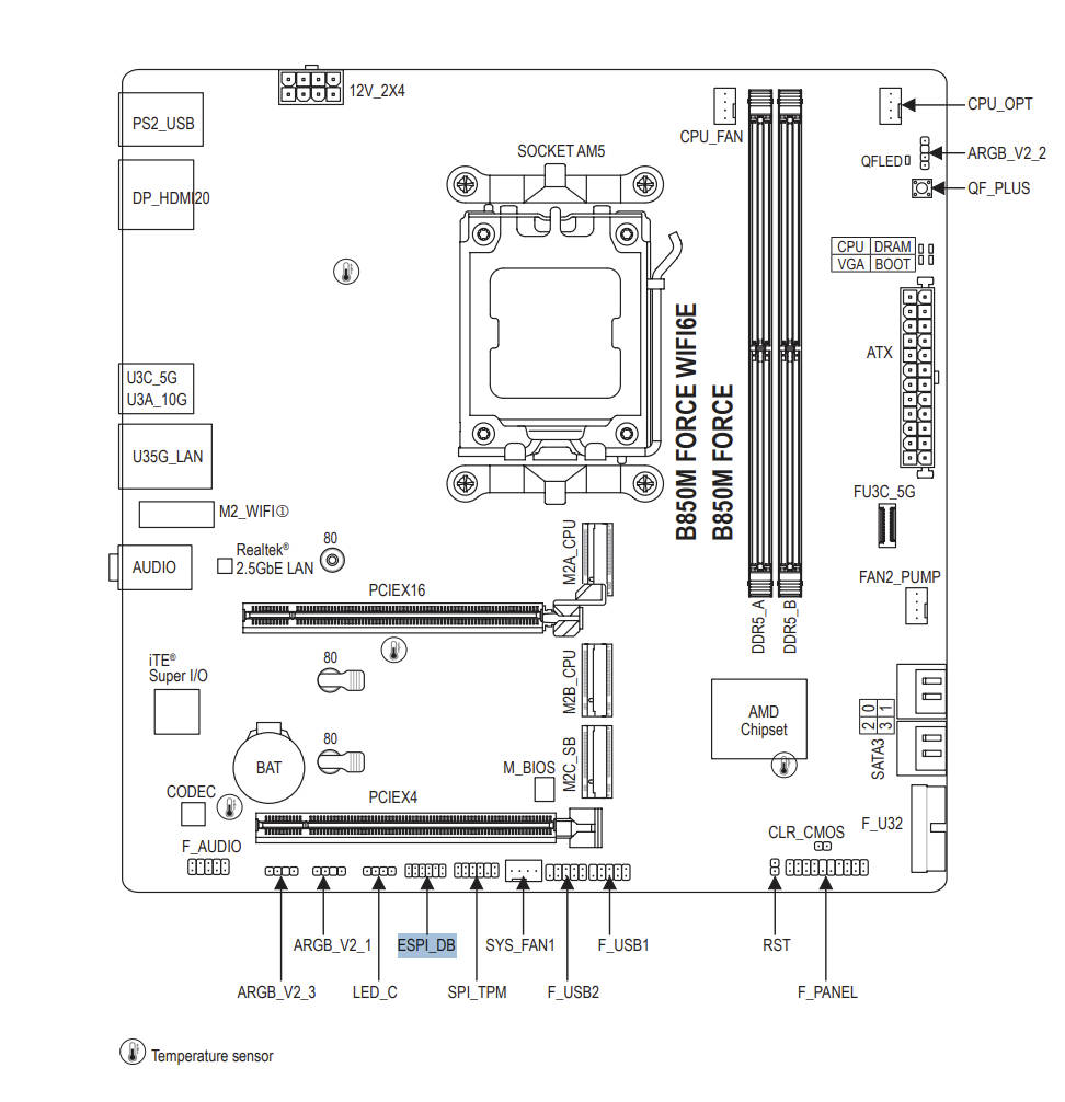 現在各家都有針對入門級主機板推出超頻向型號,技嘉也不例外,早已推出 B850M FORCE WIFI6E。為了吸引更大群體,技嘉跟進華擎的做法,把售價壓下來。這無可避免換來較精簡的規格,也意味 DEBUG CODE 不太可能出現於這種價位的主機板。華碩有 COM_DEBUG 接頭,微星有 JDSAH1 接頭,華擎有 UART1 接頭,那麼技嘉有什麼可以擴展 DEBUG CODE 的接頭?原來就是 ESPI_DB!
