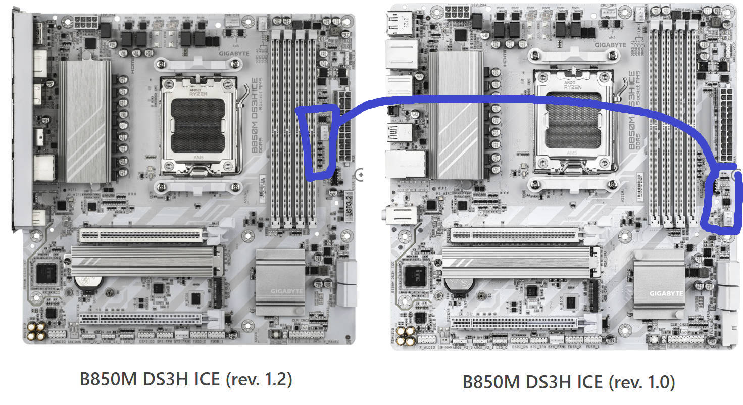 我們參考 B650M DS3H,便可看到 ATX 24PIN 左邊其實有一堆電路設計佔據整個空間。那這些電路是什麼?又為何消失了?