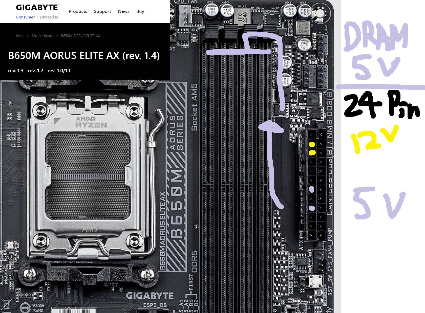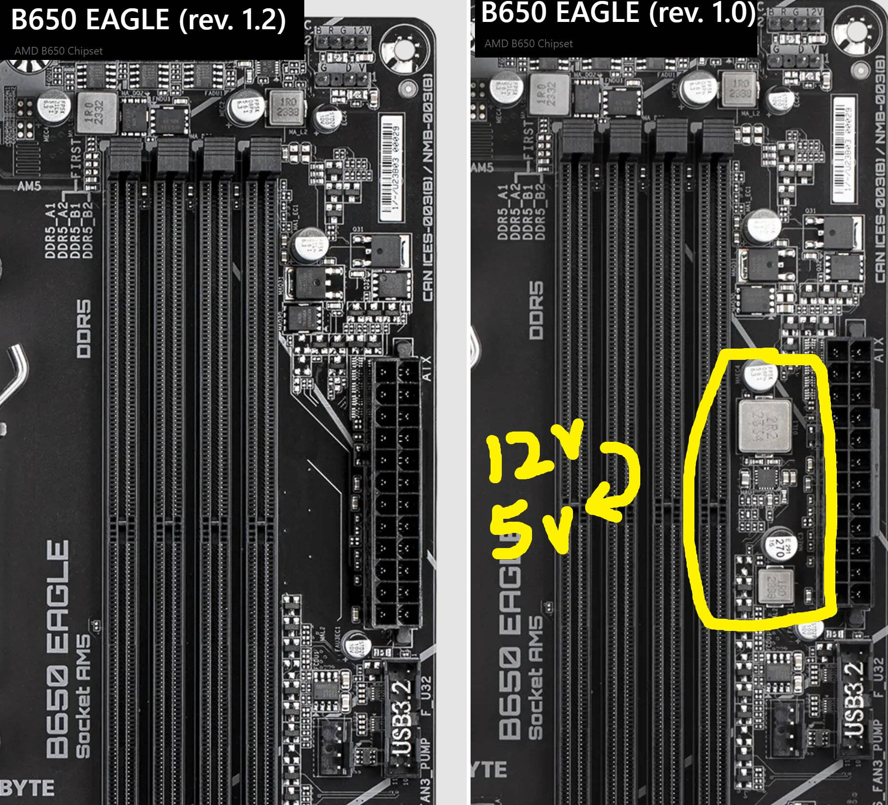 故此,在技嘉首代 DDR5 板子中,ATX 24PIN 的左側,往往會有兩顆電感、一顆晶片、多顆 MLCC 和固態電容,所組成的特別電路。後來技嘉引進新設計,放棄使用 12V 轉 5V 的設計,改為直接取 5V。至於為何要這樣做,筆者有看到網路上有回報指出,那顆 12V 轉 5V 的晶片 (RICHTEK RTQ2822A,絲印為 17=) 可能會故障 (連結)。