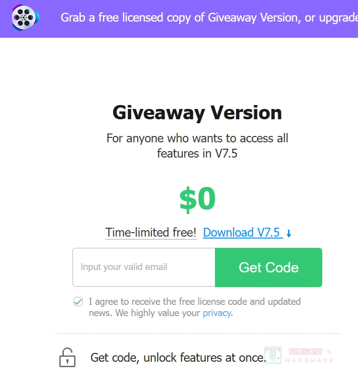 按此前往 VideoProc Converter AI 網站,點選 Download V7.5 下載活動主程式,活動序號可以輸入郵件信箱再按 Get Code 取得。