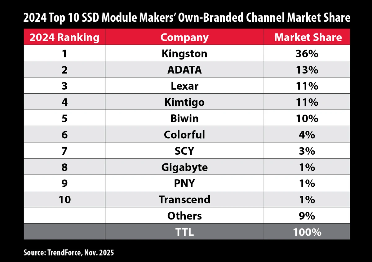 金士頓憑藉著強大的全球通路布局、頂尖的 SSD 產品陣容,以及卓越的客戶服務,2024 年不僅再度蟬聯 SSD 出貨量冠軍寶座,市佔率更較 2023 年進一步提升,以破紀錄的高市佔比 (36%),大幅領先第二的品牌 (13%),進一步鞏固其在全球 SSD 市場中無可撼動的領導地位。