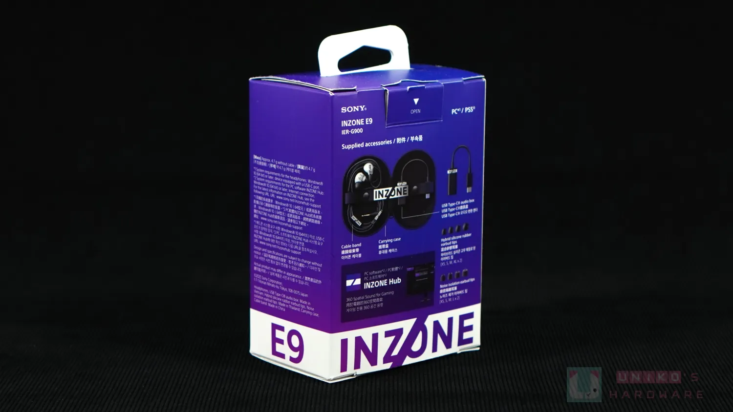 一樣先看包裝,相較於 INZONE H9 II,整體雖說也是漸變色系,但主形象色會更偏向於藍色,下方同樣採用 INZONE 同系列設計,來呈現 INZONE LOGO 與 E9 的型號名稱,不過 INZONE E9 只能給 PC 與 PS5 使用。外盒背面可能是因為攜帶盒太有特色了,是連同耳機照片一起呈現,另外也有軟體與配件的說明。