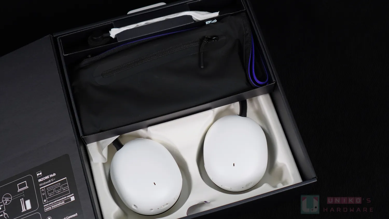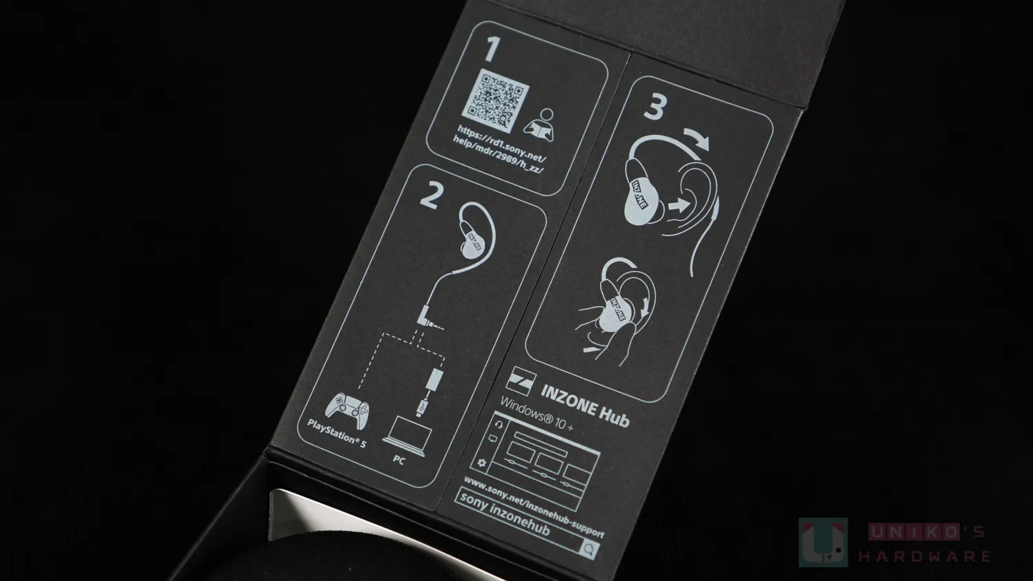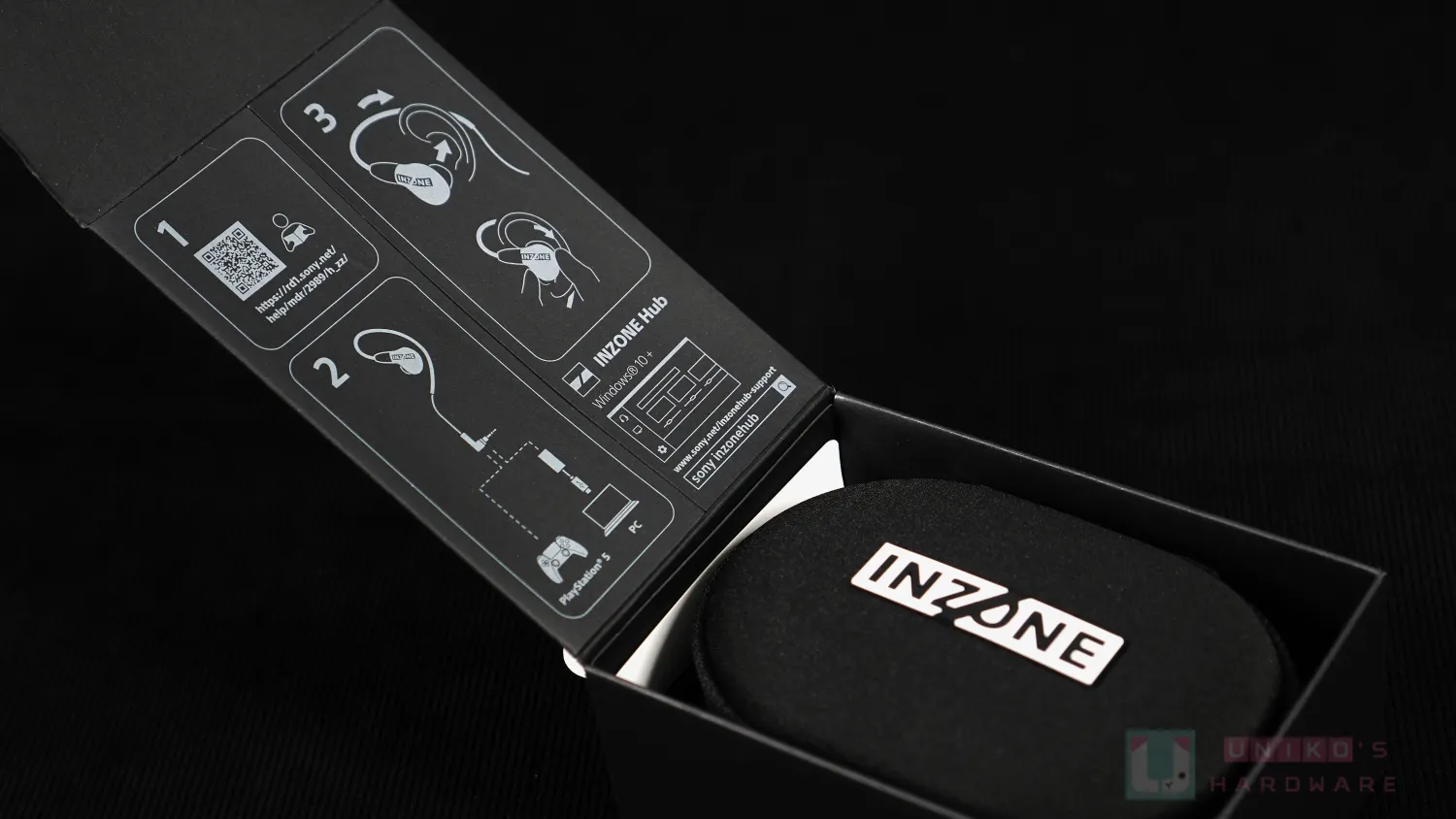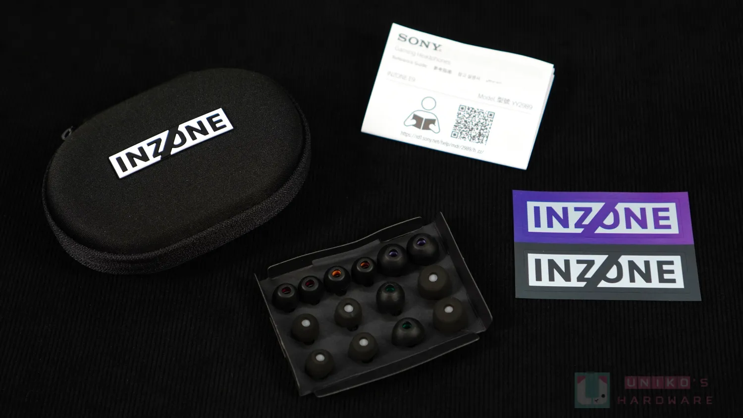 打開外盒,同樣有使用步驟說明,步驟 1 是說明指南 QR Code、步驟 2 是連接 PS5 與 PC 的圖示教學,步驟 3 是教你怎麼戴上入耳式耳機,最後的角落空間是用來指引你 INZONE Hub 的下載位置。往另一側看,會看到一個硬殼攜行包,取出配件會看到各式耳塞、文件、與 INZONE 信仰貼紙。