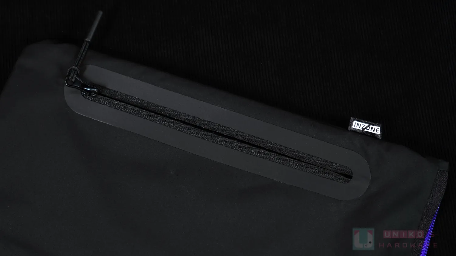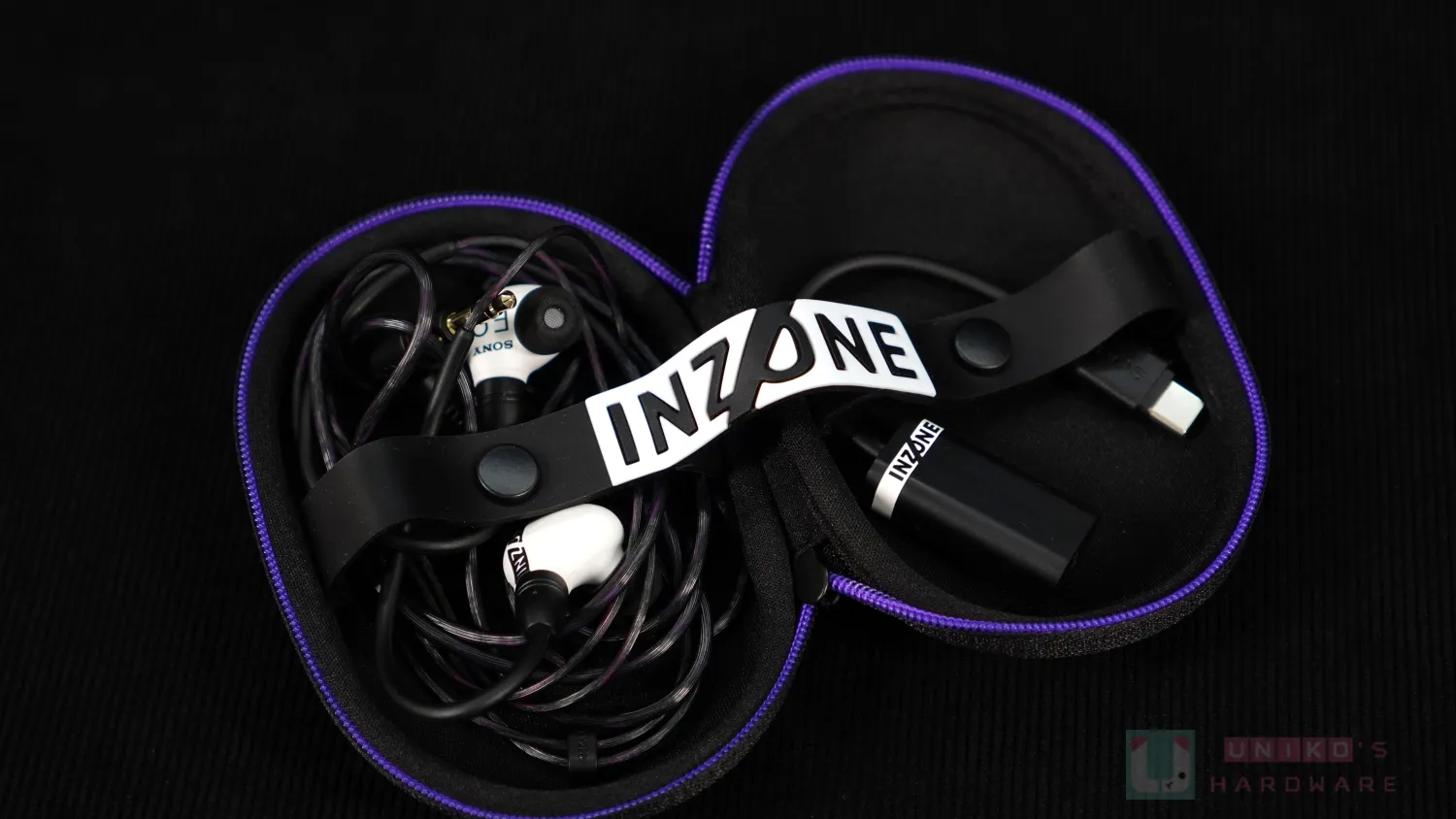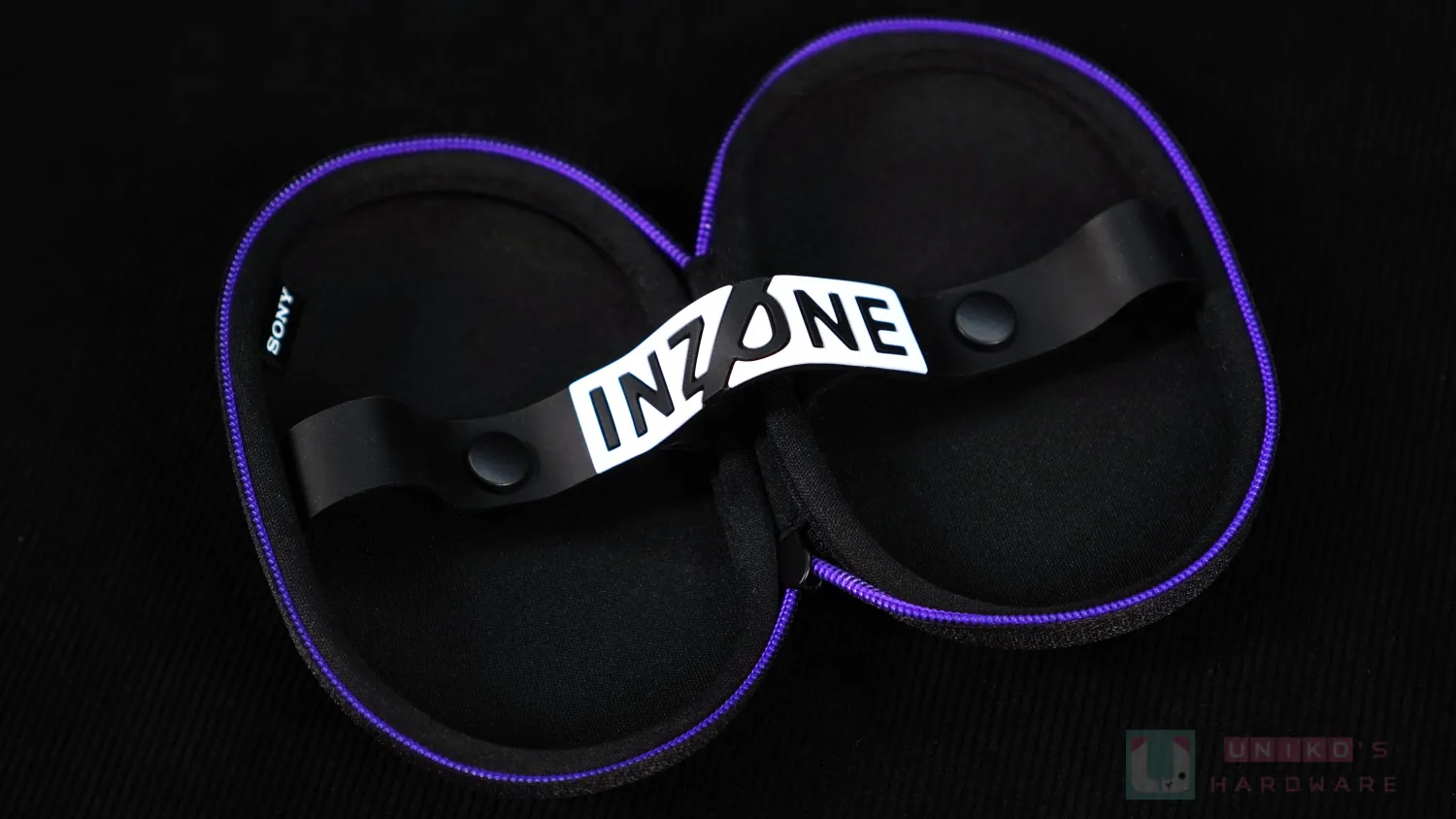 配件我們最感興趣的就是那個可攜帶的收納軟袋!小小的 INZONE 布標、隱藏拉鍊、內層跳紫色拉鍊等設計都讓其質感度提升。線材方面不只有妥善捆好,耳機線還做了圖示,讓使用者能辨別插上耳機線材的方向。可拆卸式麥克風收音區塊比起市面常見的電競耳機更大!