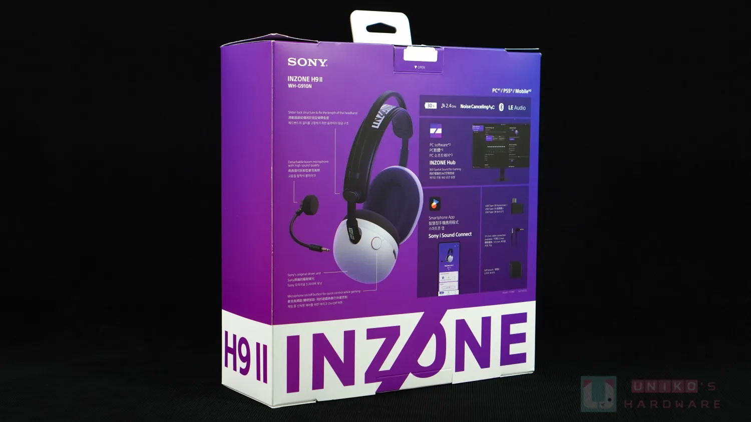 我們先從頭戴式的 INZONE H9 II 包裝看起,整體包裝以藍到紫漸變色作為主要形象色,下方區塊由正面到側面,以白底與紫色背景呈現產品名稱,識別度很好。INZONE H9 II 可支援 PC、PS5、與手機,背面特色說明直接給你一個產品圖,搭配文字介紹"可調整頭帶、可拆卸麥克風桿、靜音快速紐"等細節,也有 INZONE Hub、Smartphone App 的軟體簡介。