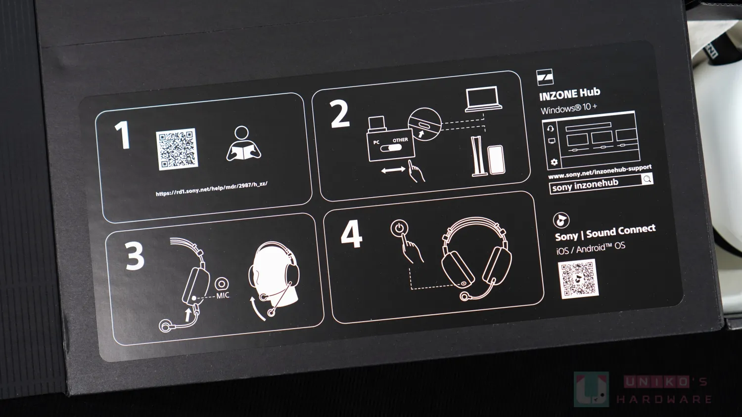 打開外盒後,步驟 1 是一組 QR Code,這是耳機的說明指南,讓你輕鬆照著步驟開始使用 INZONE H9 II,步驟 2 是提醒使用不同設備要切換開關,步驟 3 是連接麥克風與調整位置的圖片說明,步驟 4 是電源開關圖示。一旁則是指引你 INZONE Hub 的下載位置,以及導引掃描安裝手機版本的 APP Sony | Sound Connect。