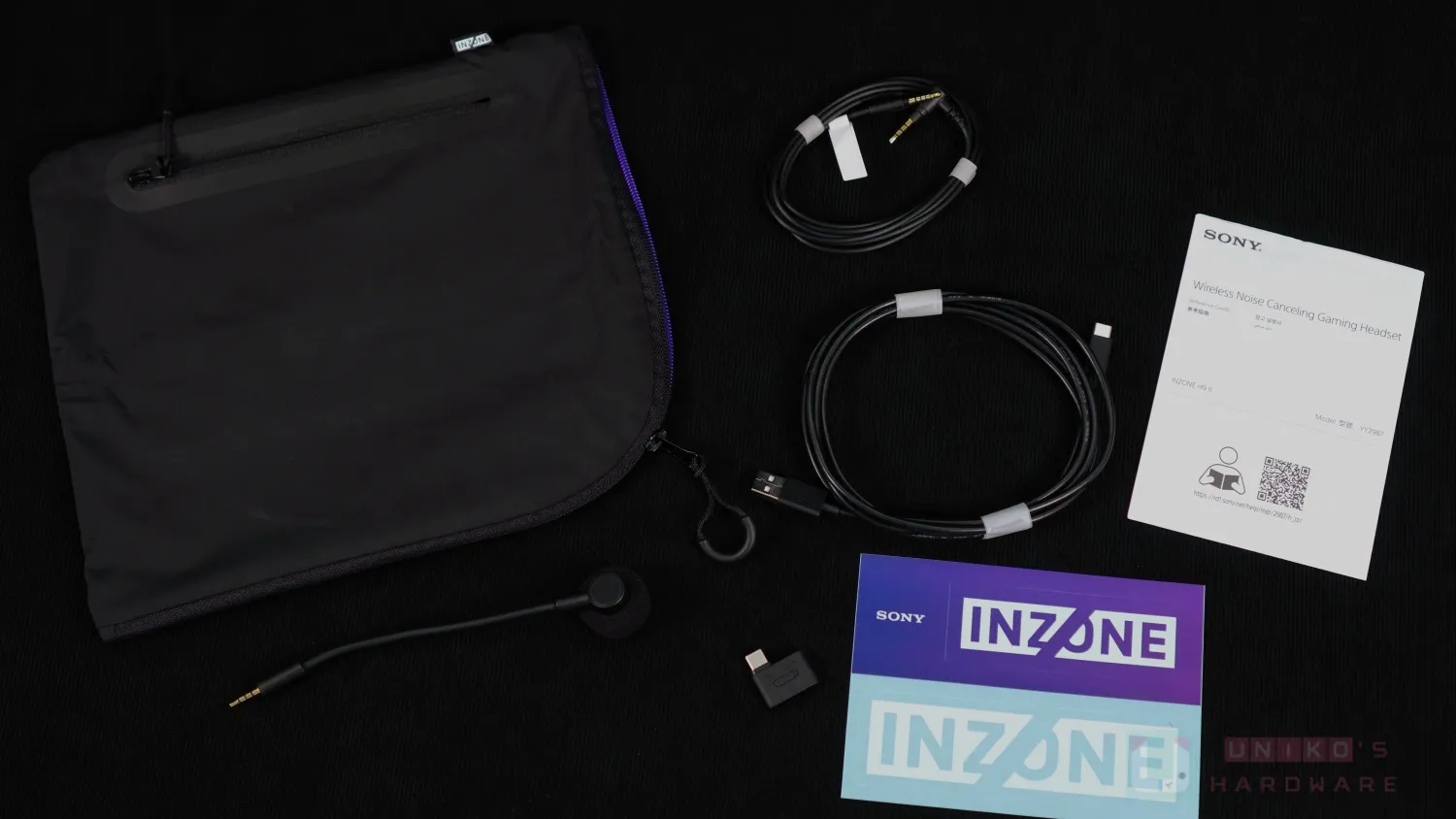 包裝另一側可以先看到放置著耳機本體、可拆卸式麥克風桿、收納袋,取出全配件還會看到 mini jack 3.5mm 耳麥線 (三環)、USB-A to USB-C 連接線、USB-C 接收器、紙本文件、與兩張不同顏色的 INZONE 信仰貼紙。