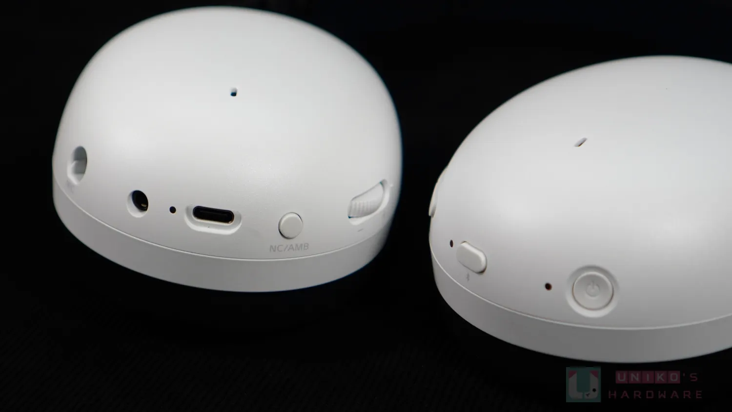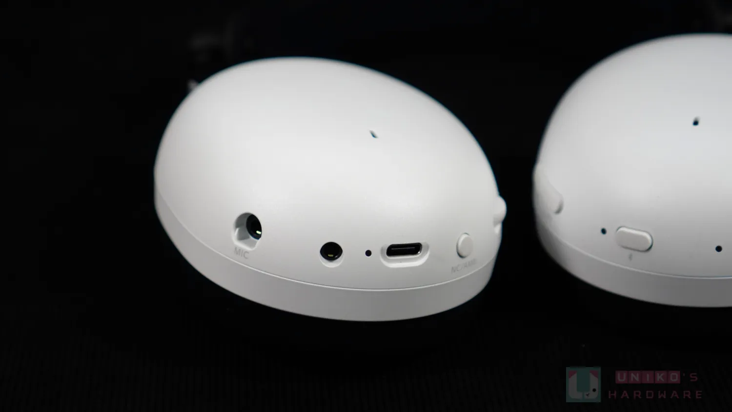 左邊耳罩下方依序設有吊桿麥克風插孔、3.5 mm jack 插孔 (三環)、充電指示燈、USB-C 連接埠、NC / AMB (噪音消除 / 環境音效模式) 切換按鈕、音量調整滾輪,上方還有一顆能快速切換耳機靜音的按鈕。