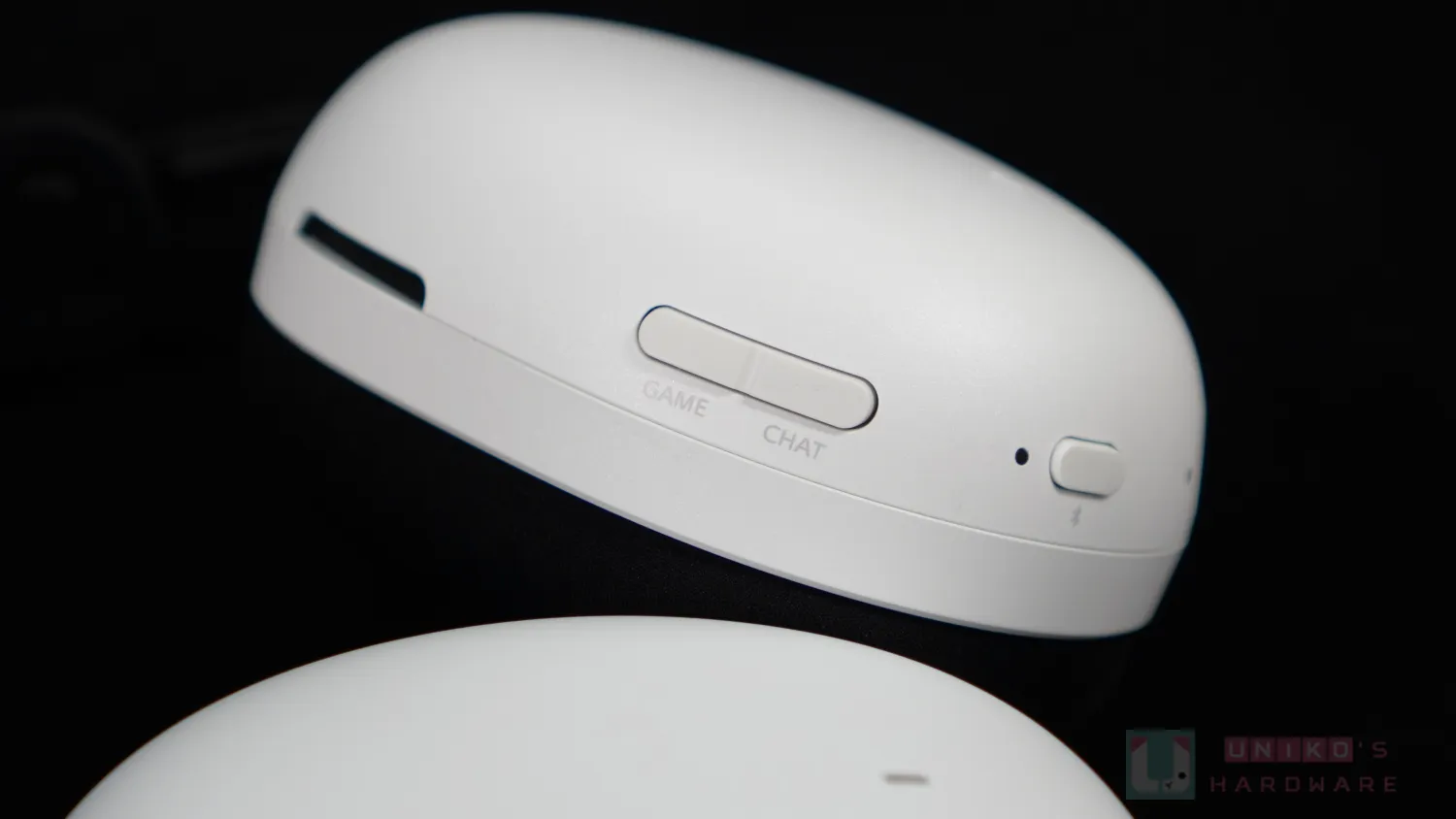 右邊耳罩設有電源紐、電源指示燈 (白光)、藍牙按鈕、藍牙指示燈 (藍色)、GAME / CHAT 遊戲與聊天平衡按鈕。