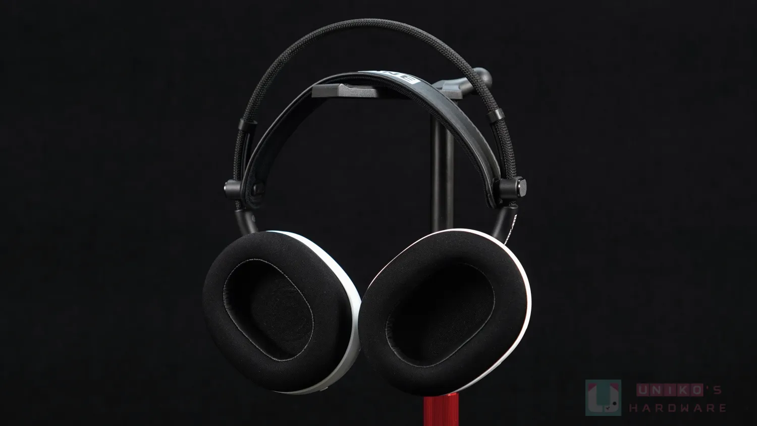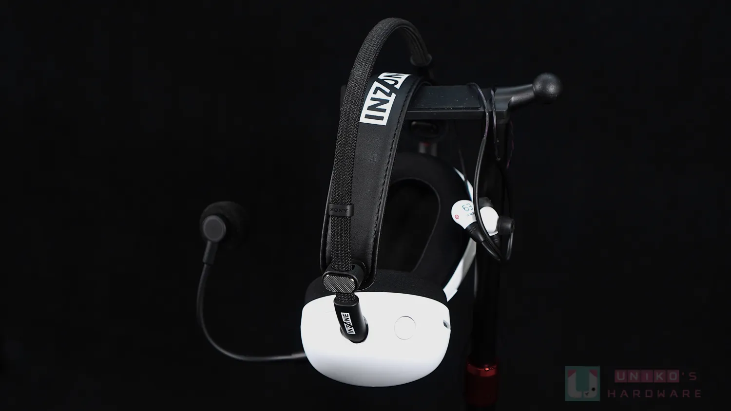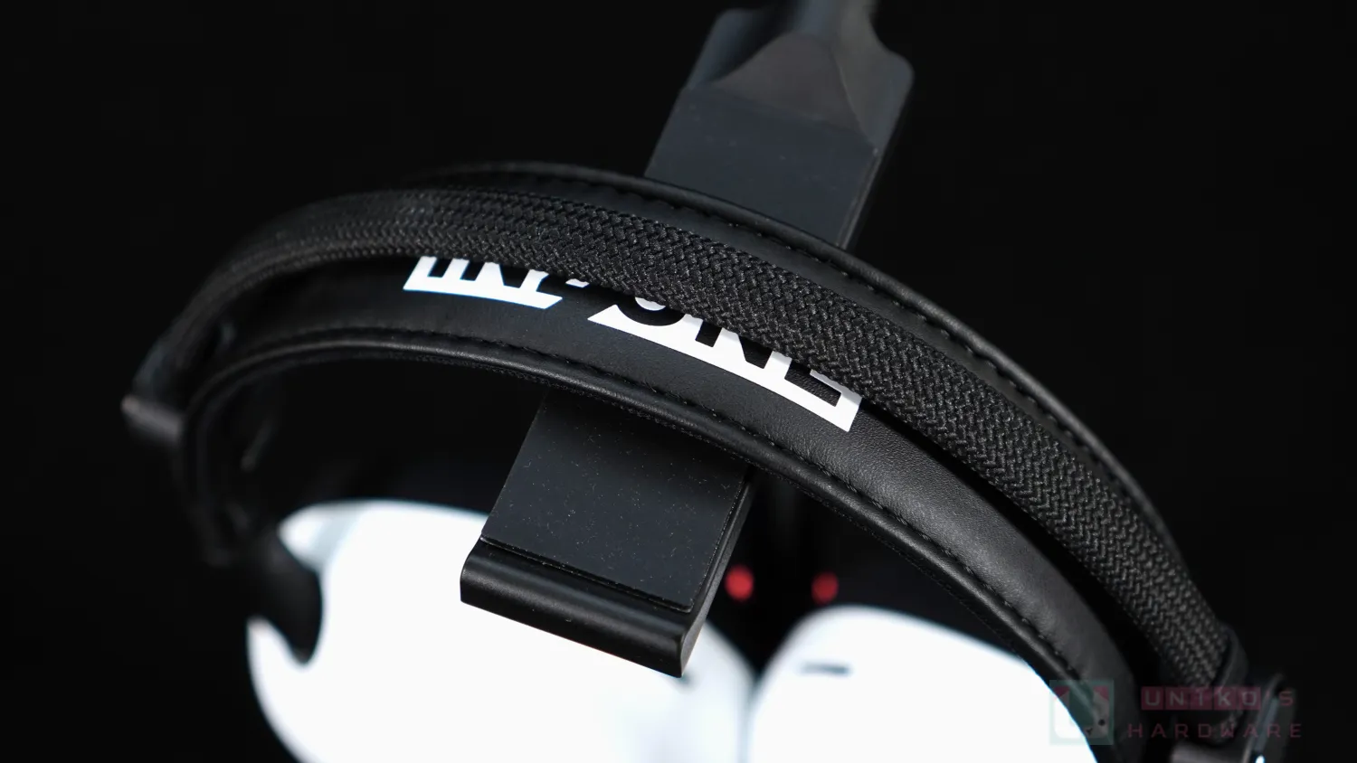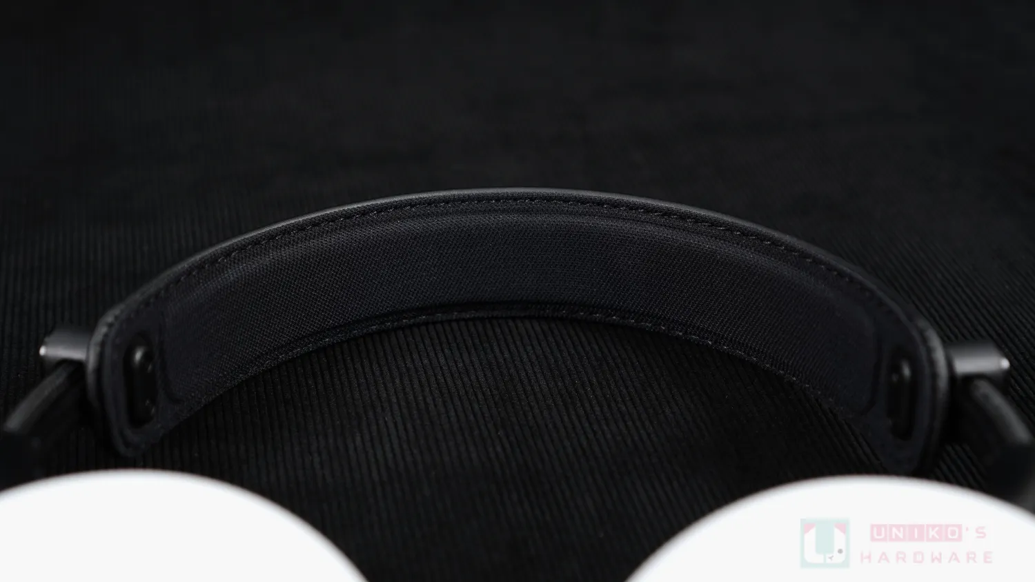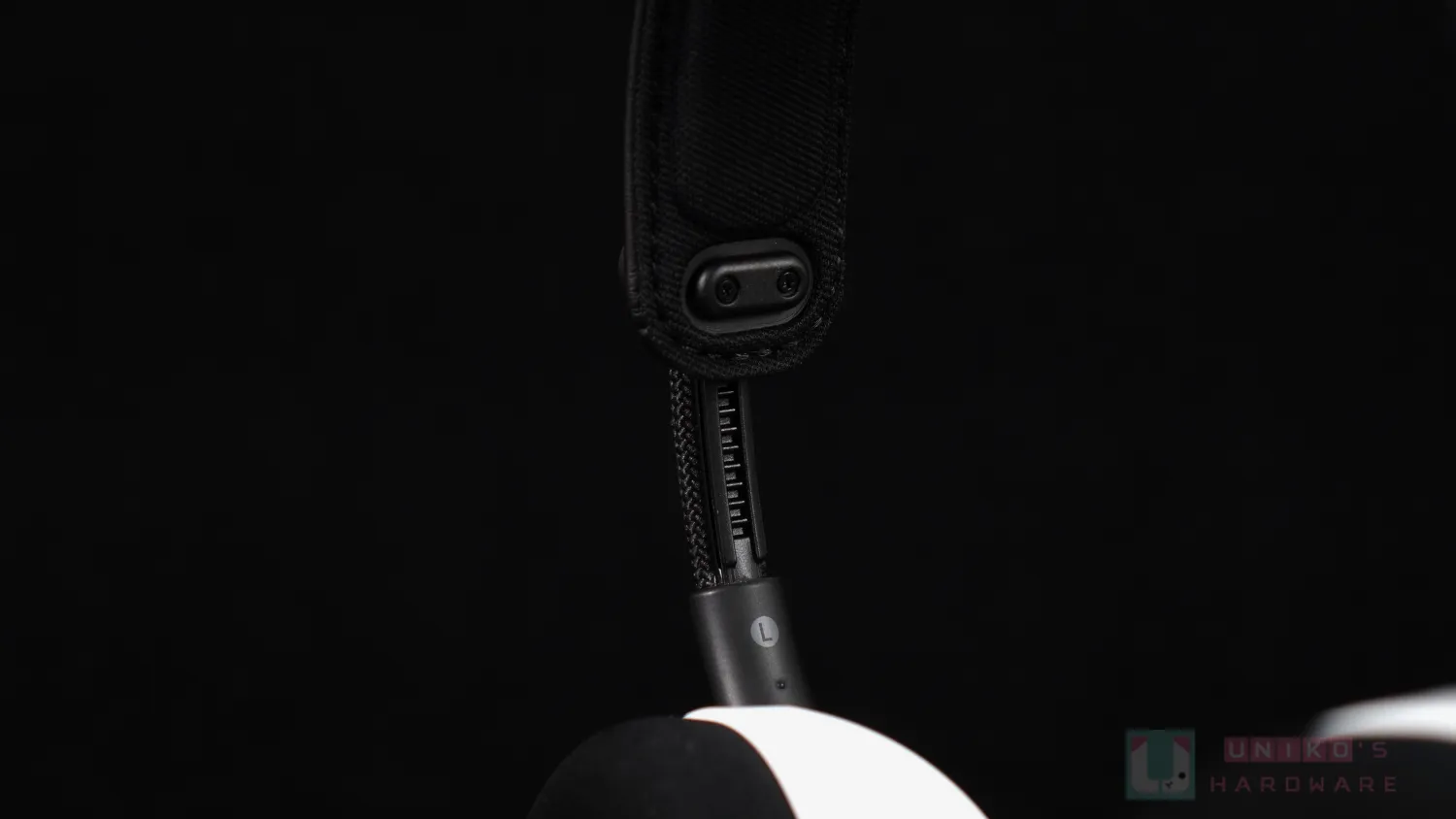 頭戴設計與以往常見的競品都不同,雖然內側不是軟軟的頭帶,但以極簡化的風格來看,頭頂好像也不需要使用這個材質。頭帶使用編織材質包覆調整用的調整帶,調整頭部可戴空間的方式,是透過按下左右側的滑動旋紐,再延伸或縮短頭頂位置的長度,從內側可以看到有一格一格的固定處。