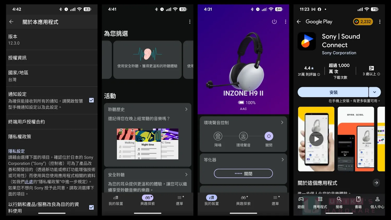 連接裝置後可以在左上角看到對應的產品名稱、連接狀態、電量等資訊。聲音設定頁,可以設定等化器、空間音效、降噪、音量、麥克風等細項設定。