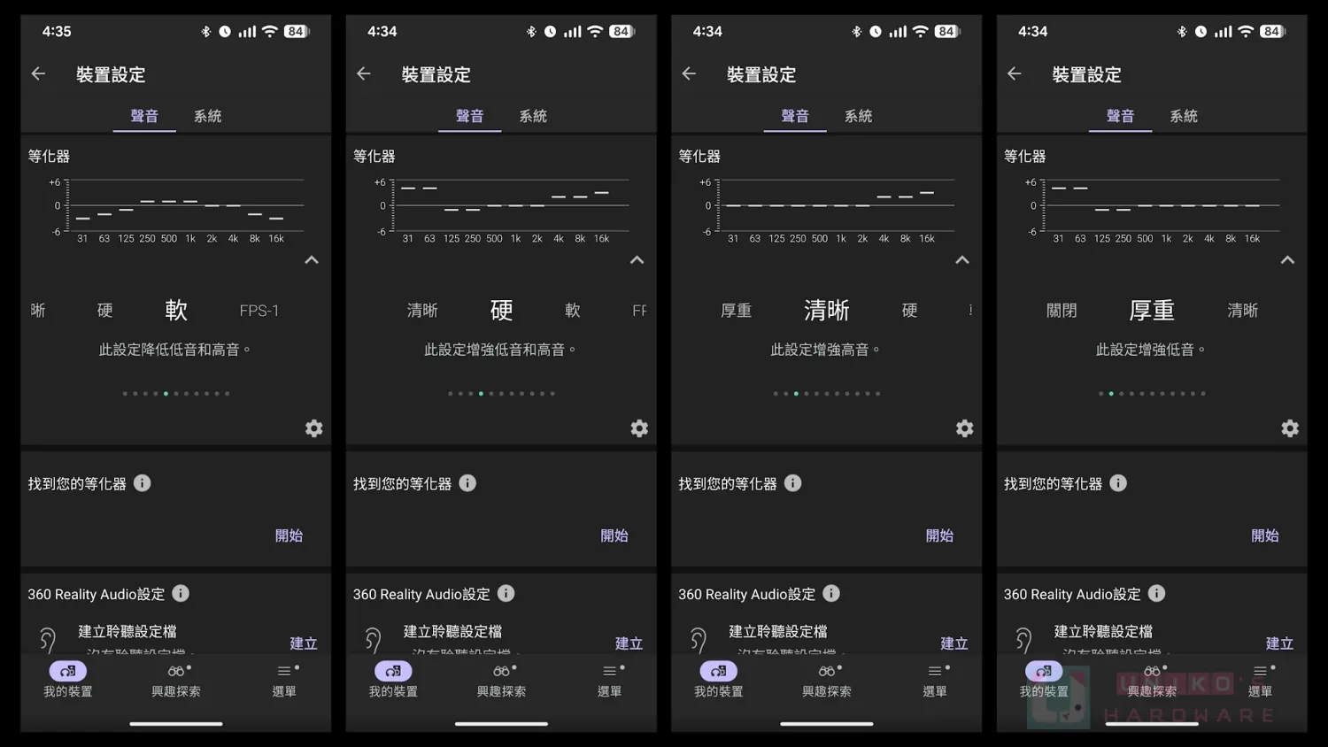 手機版本介面更為簡單直覺,聲音頁籤的等化器,還有多了"軟 / 硬 / 清晰 / 厚重"可選。