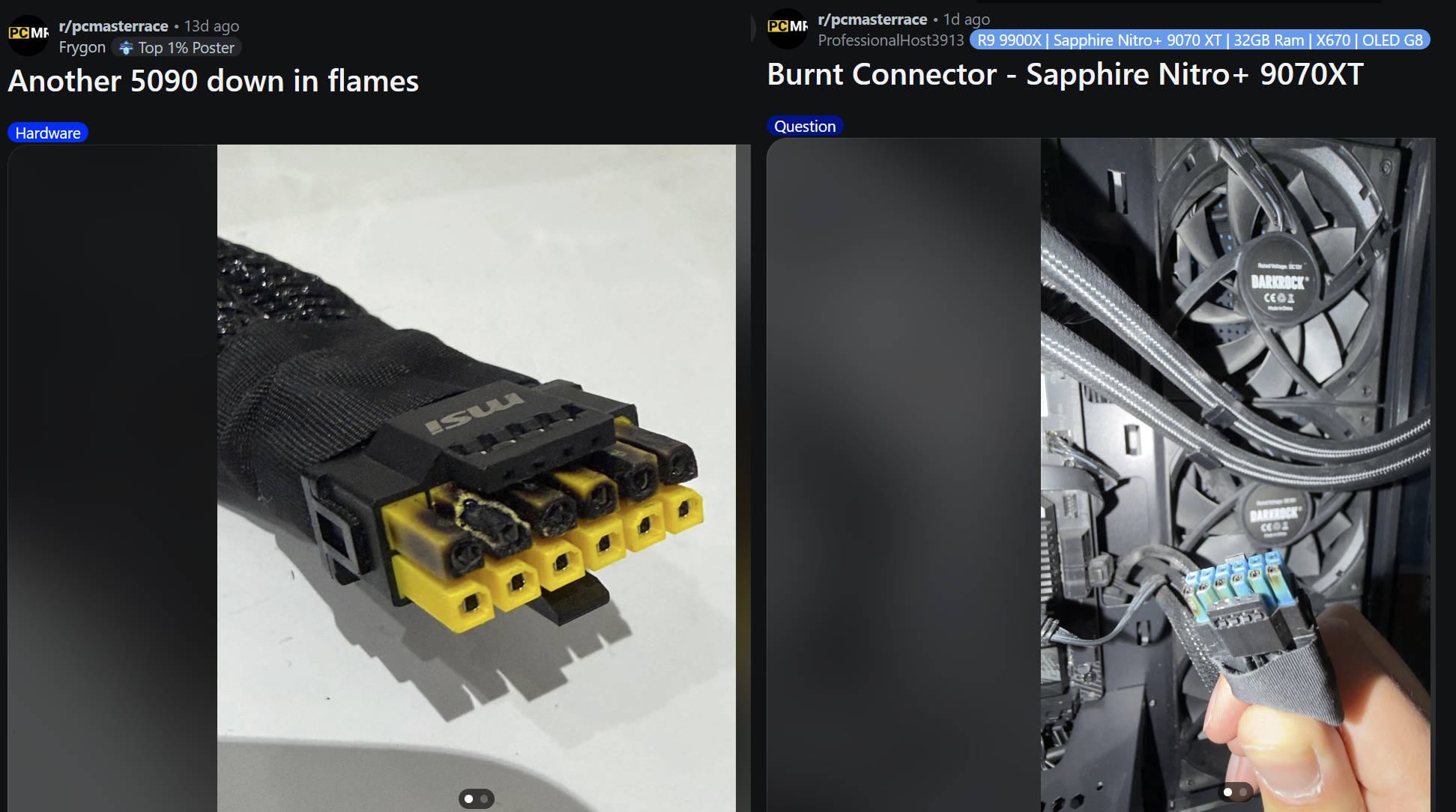 剛好這兩個案例分別是 GEFORCE RTX (連結) 和 RADEON (連結),顯示卡分別來自微星和藍寶石,這裡各位就不要針對品牌。兩位事主都用上顯示卡所附的 16PIN 轉接線,在使用一段時間後,都遇上突然黑畫面當機的問題,最終發現是顯示卡的 16PIN (含轉接線) 燒掉。微星 RTX 5090 那位事主,其電供更是含 16PIN 直出線材 (雙 8PIN 轉 16PIN) 的 CORSAIR HX1200I。那到底發生什麼事?