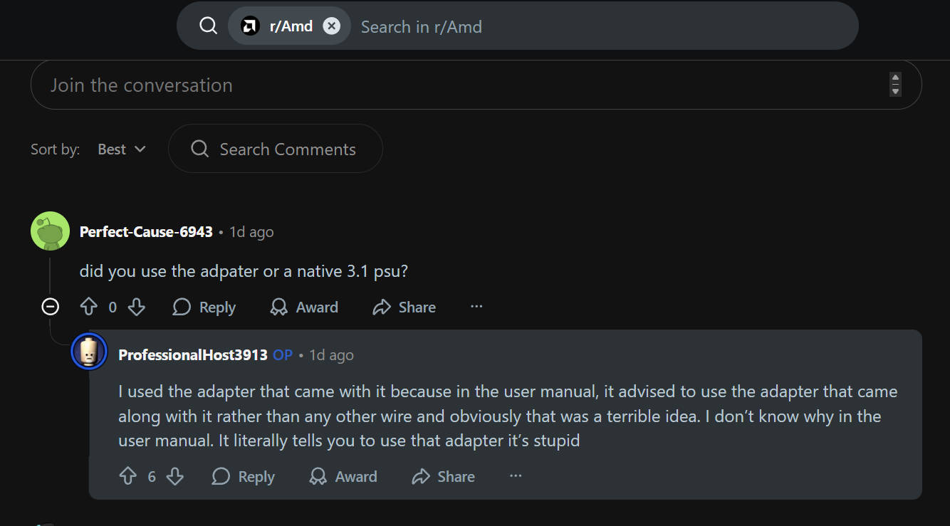 然後是該位藍寶石使用者 (連結),在留言區表示藍寶石顯示卡的使用說明中,建議使用 ADAPTER 轉接線,加上自己的電供不含 16PIN 設計,所以才用上顯示卡附送的轉接線。